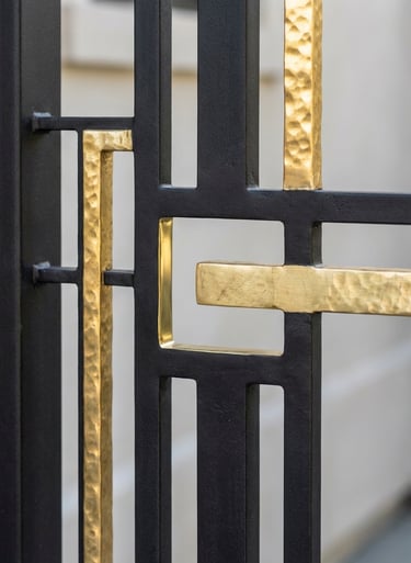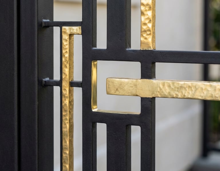 Design and fabrication of a monumental main gate combining blackened steel with gold-leaf accents, featuring automated entry systems and reinforced security integration.