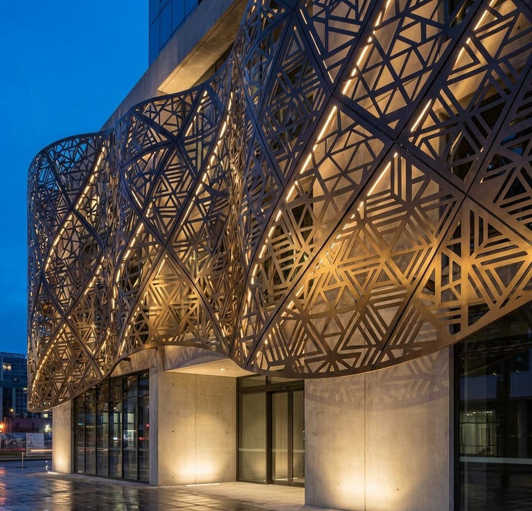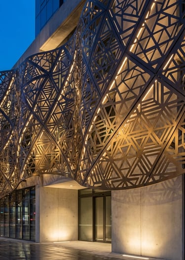 An architectural landmark featuring 2,000 sqm of intricate laser-cut aluminum panels with traditional geometric patterns, creating a stunning visual interplay of light and shadow.